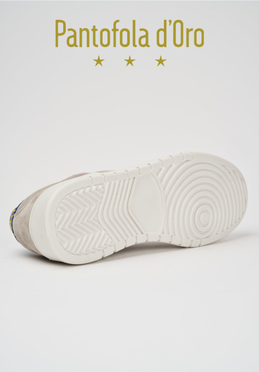 La parte superior es de corteza y luce las tres estrellas de la Pantofola d'Oro perforadas en los laterales. La parte superior está revestida con una puntera de corteza que se extiende hasta la zona bajo los cordones, y está marcada por costuras que realzan el acolchado inferior.
